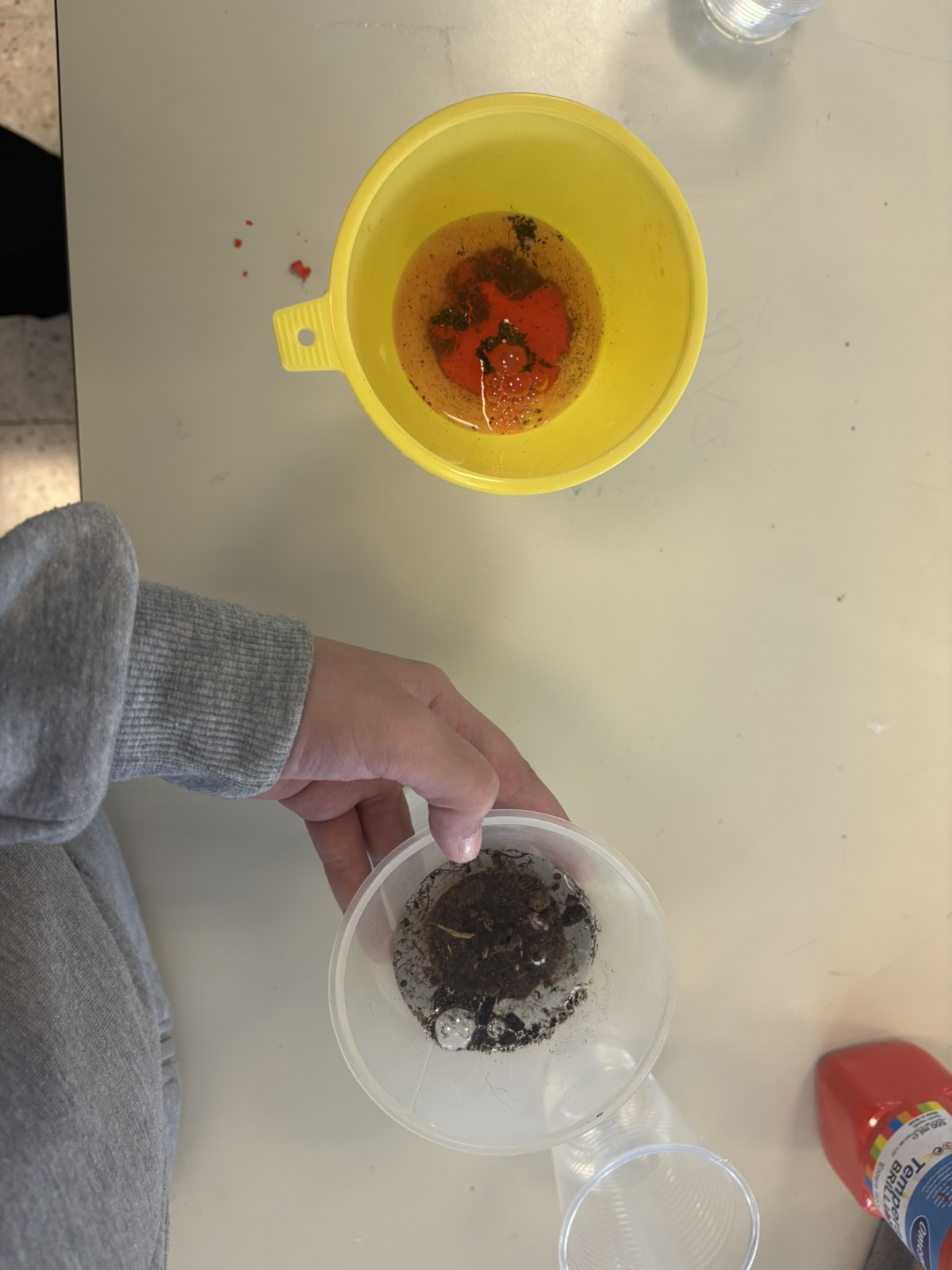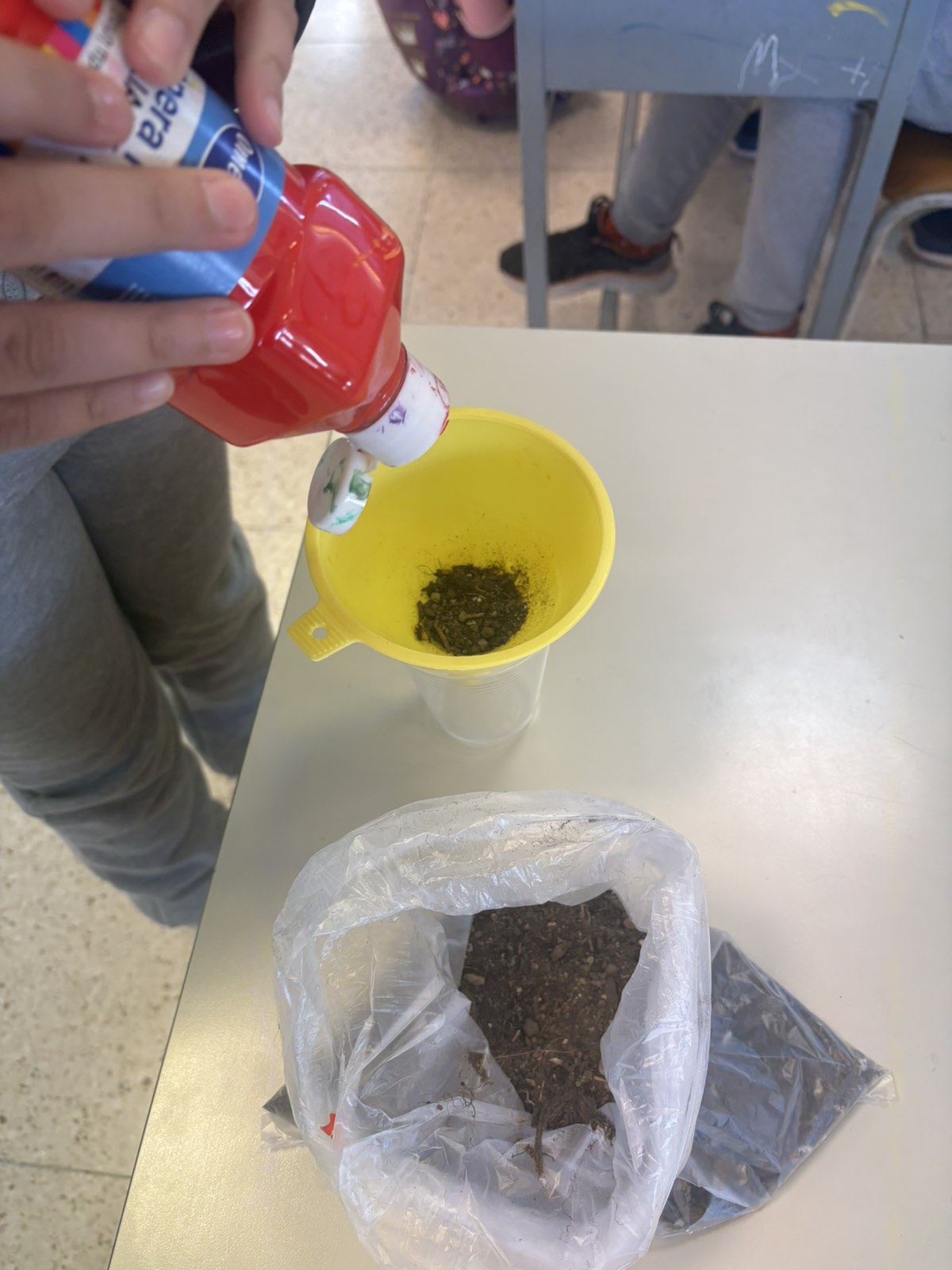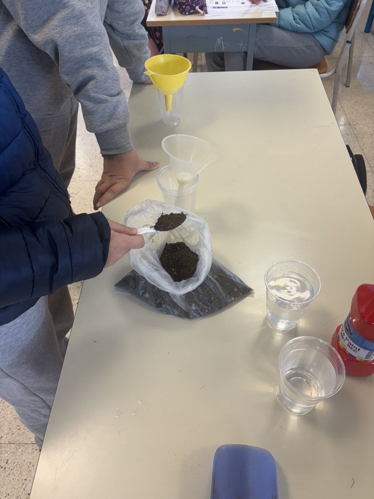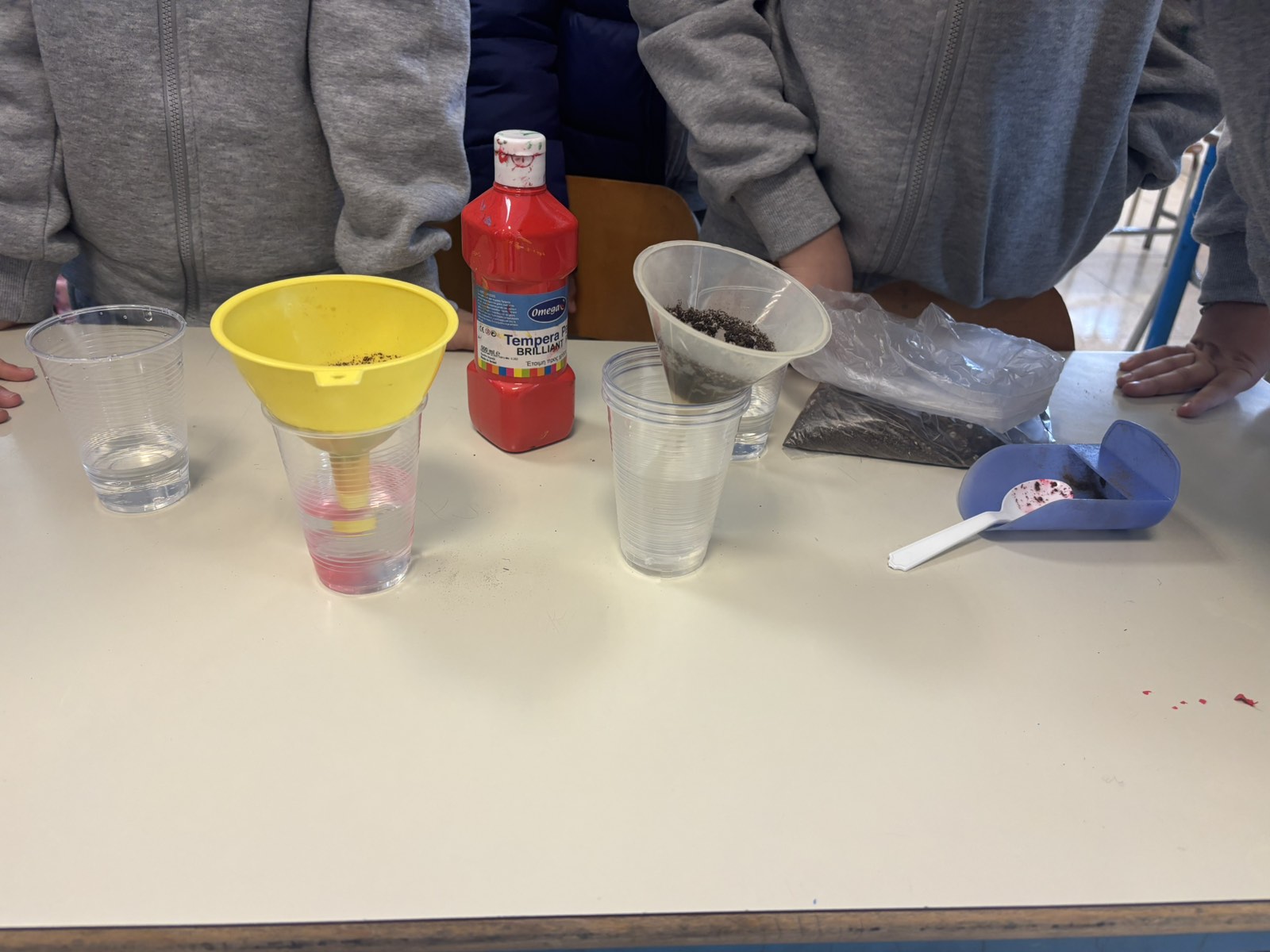 | Στα πλαίσια της ενότητας «Φυσικό Περιβάλλον», οι μαθητές καλούνται να κάνουν υποθέσεις για το πώς ρυπαίνεται το νερό των θαλασσών/λιμνων/ποταμών, από επικίνδυνες ουσίες που βρίσκονται στη ξηρά. Εκτελώντας το πείραμα επιβεβαίωσαν τις αρχικές υποθέσεις τους, οι οποίες στήριζαν ότι το νερό της βροχής μεταφέρει επικίνδυνες ουσίες από την ξηρά στο νερό της θάλασσας, της λίμνης και των ποταμών. |