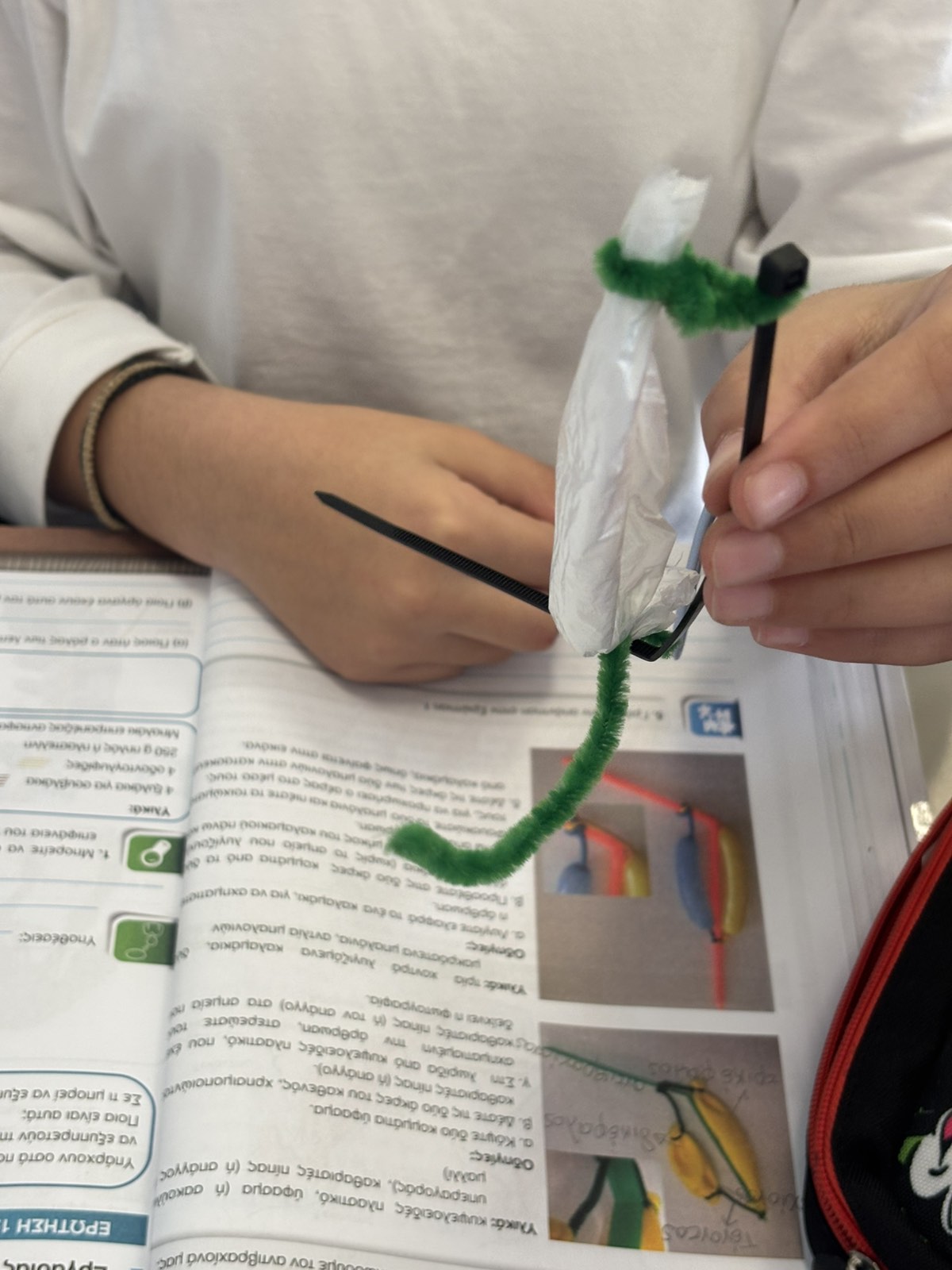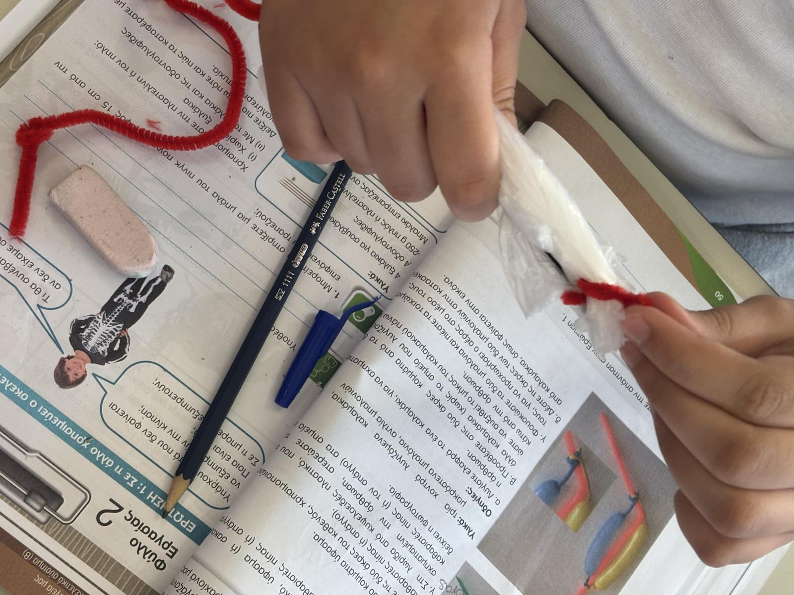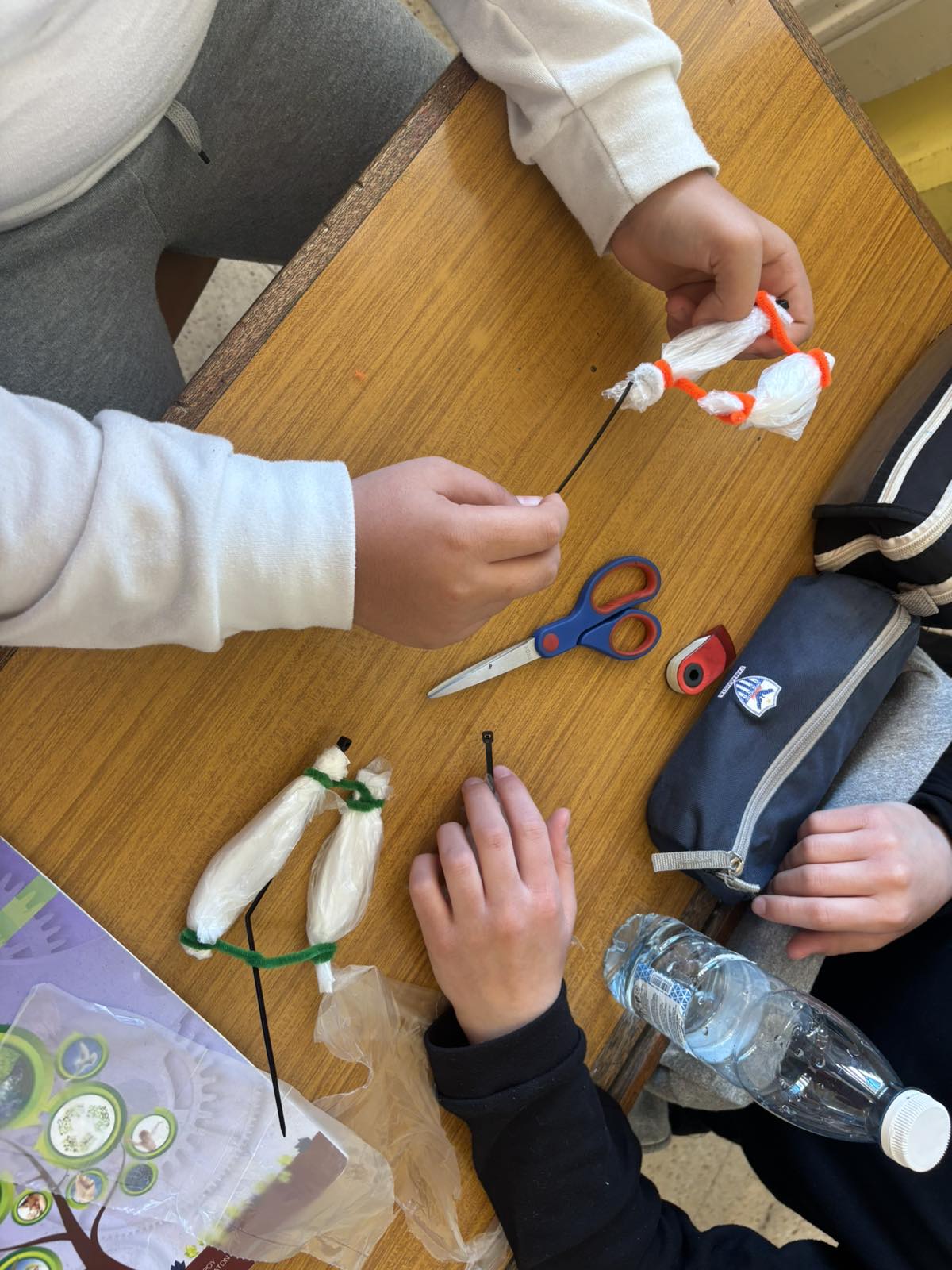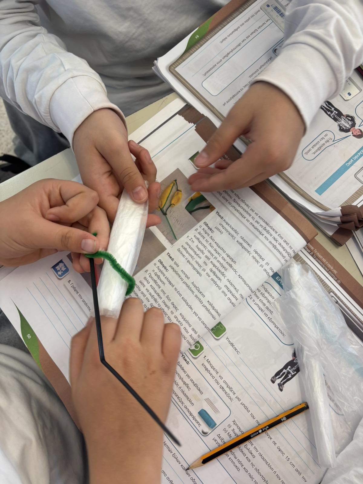 Οι μαθητές αναπαριστούν με υλικά τους μύες και τα οστά ώστε να αντιληφθούν τη συνεργασία μεταξύ τους για να δημιουργηθεί η κίνηση.
